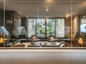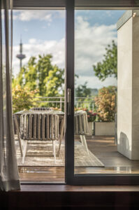 - Große Fenster mit Blick ins Grün und auf die Skyline
